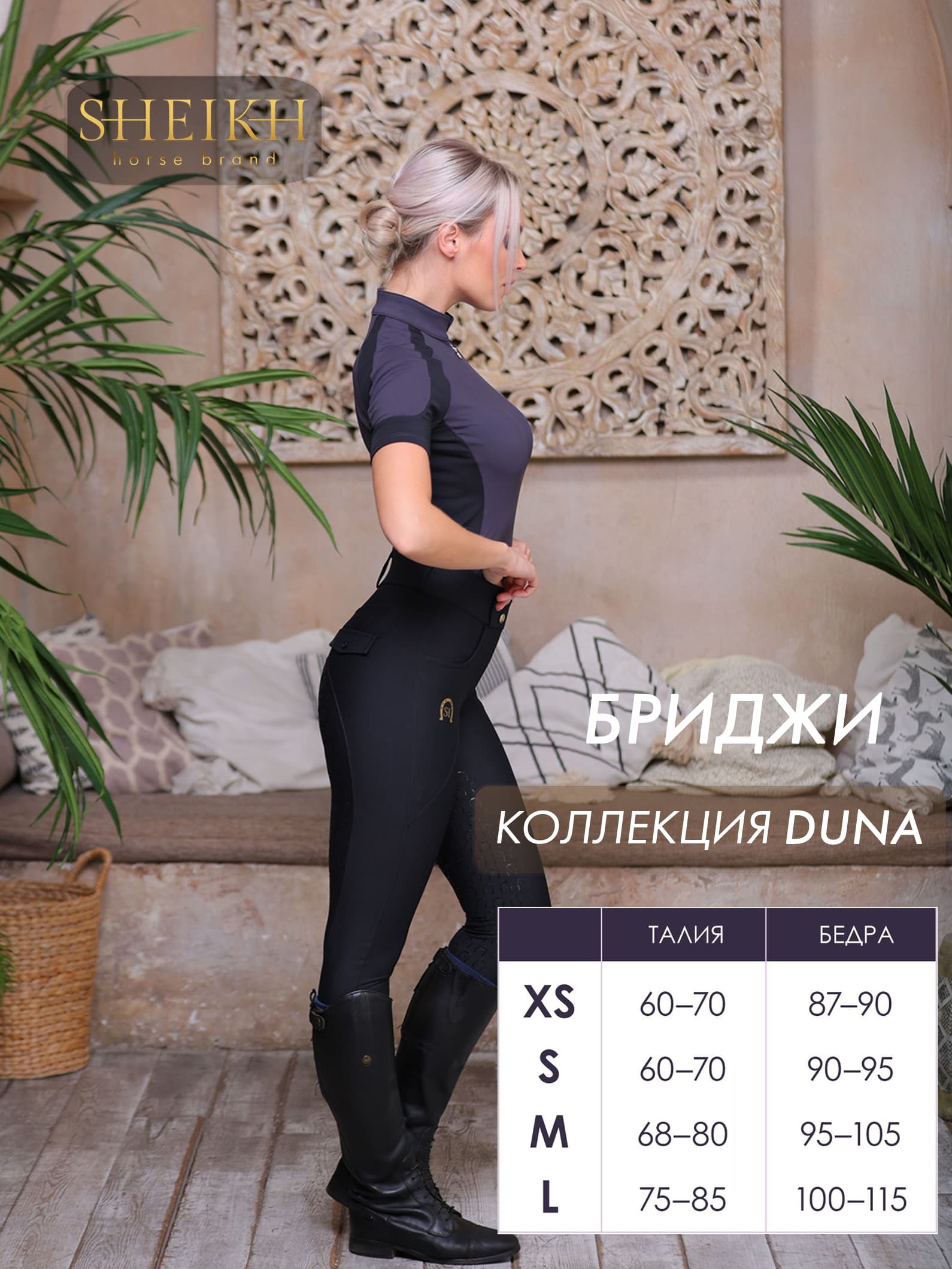 Бриджи DUNE - это воплощение элегантности и утонченности. Посадка с кокеткой подчеркнет все достоинства вашей фигуры. Благодаря высокой талии, ваша осанка будет выглядеть более статно и грациозно. Каждая деталь подчеркивает вашу индивидуальность, особенность и трепетное отношение к себе. Вам обеспечен великолепный силуэт в седле с бриджами от бренда SHEIKH. Детали: Бриджи изготовлены из спортивной ткани. Полная силиконовая лея в виде логотипа бренда. Брендирование на бедре. Уход: Машинная стирка на деликатном режиме, при температуре не более 30°С. Сушка на открытом пространстве