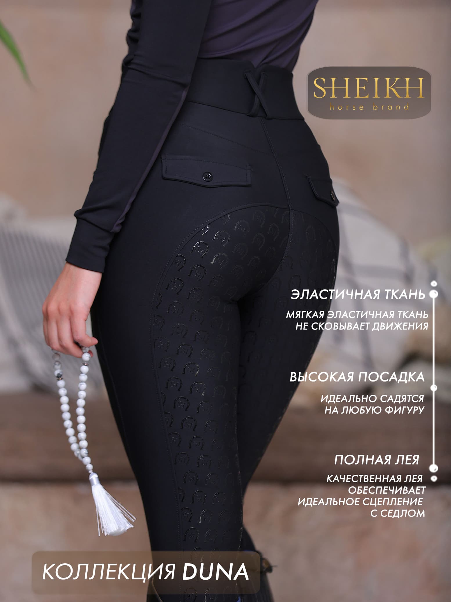 Бриджи DUNE - это воплощение элегантности и утонченности. Посадка с кокеткой подчеркнет все достоинства вашей фигуры. Благодаря высокой талии, ваша осанка будет выглядеть более статно и грациозно. Каждая деталь подчеркивает вашу индивидуальность, особенность и трепетное отношение к себе. Вам обеспечен великолепный силуэт в седле с бриджами от бренда SHEIKH. Детали: Бриджи изготовлены из спортивной ткани. Полная силиконовая лея в виде логотипа бренда. Брендирование на бедре. Уход: Машинная стирка на деликатном режиме, при температуре не более 30°С. Сушка на открытом пространстве