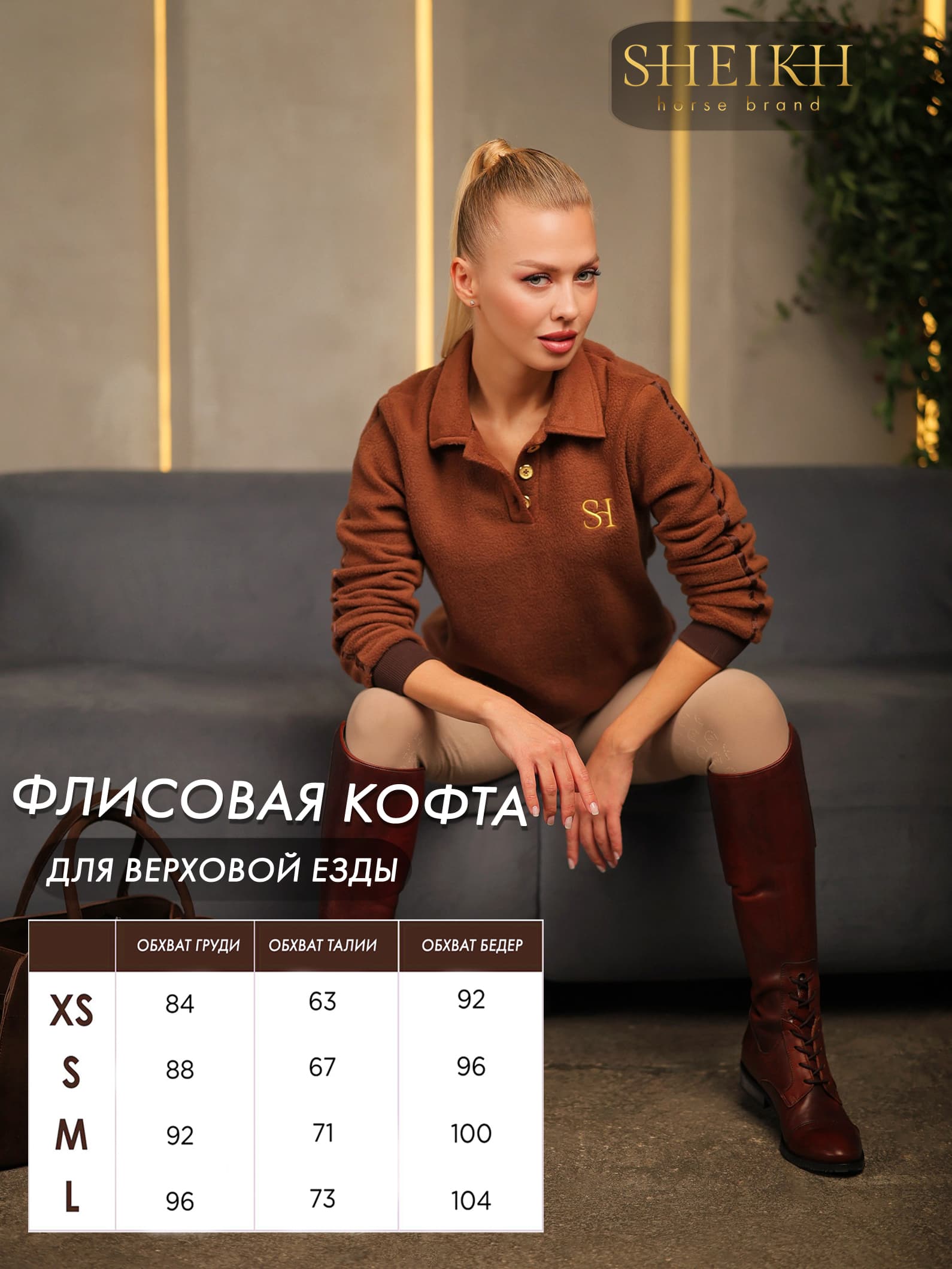 Кофта для верховой езды, конного спорта Кофта с длинным рукавом Кофта флисовая Флисовая кофта от бренда SHEIKH окутает вас мягкостью, теплом и заботой. Великолепный плюшевый флисовый материал согреет Вас в непогоду, защитит от ветра и добавит нежности в повседневные дела. Воротничок на золотых пуговицах дает свободу выбора. Плотный материал на манжетах и поясе поможет отрегулировать длину рукава и кофты. Каждая деталь подчеркивает вашу индивидуальность, особенность и трепетное отношение к себе. Кофта украшена фирменной вышивкой золотыми нитками и лампасом на рукаве. Детали: Изготовлена из плотного флиса 270 гр м2. Состав: 100 % полиэстер. Фурнитура: латунь Брендирование на груди. Уход: Машинная стирка на деликатном режиме, при температуре не более 30С Сушка на открытом пространстве