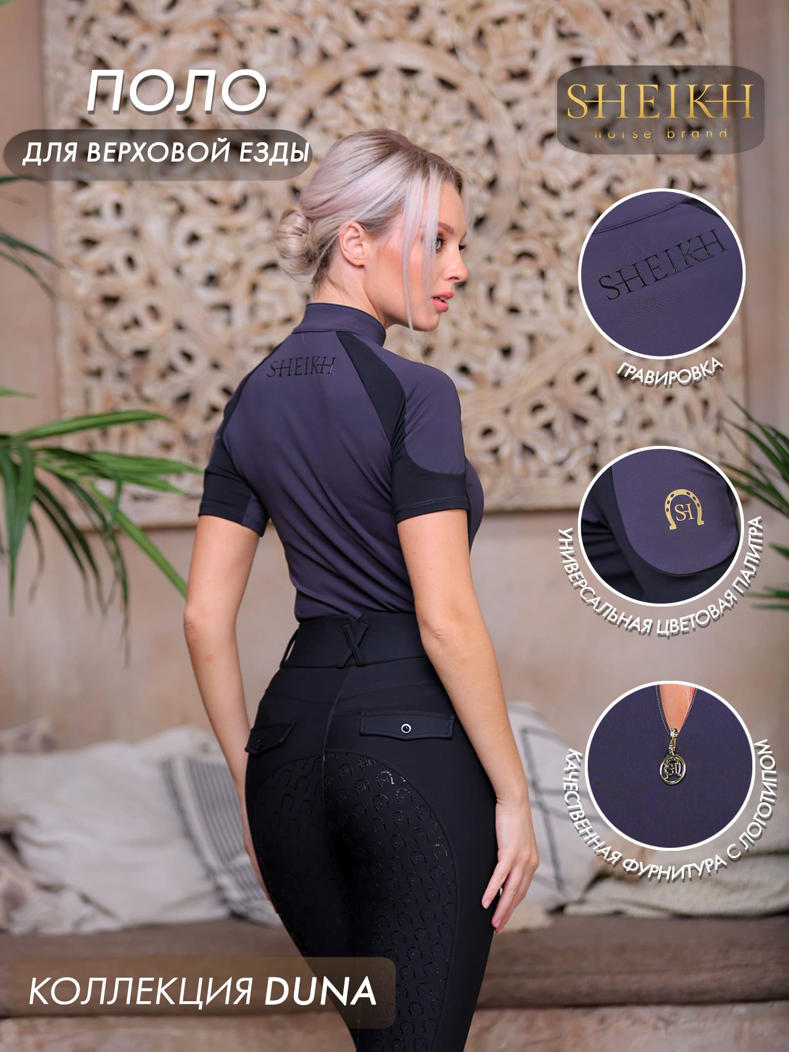 Поло для верховой езды, конного спорта Поло DUNE создано для того, что бы вы получили удовольствие от верховой езды в теплую погоду. Мягкая, спортивная ткань быстро выводит влагу и приятна к телу. Весь дизайн стремиться подчеркнуть ваш силуэт и элегантность линий. Рукав реглан обнимает ваши плечи. Скрытая молния дает свободу действий и выбора. Фирменная фурнитура с логотипом удобно ложился в руку. Каждая деталь подчеркивает вашу индивидуальность, особенность и трепетное отношение к себе. Вам обеспечен великолепный силуэт в седле с поло от бренда SHEIKH . Детали: Изготовлено из спортивной ткани. Состав: 20% спандекс 80% полиэстер. Потайная молния. Фурнитура: латунь Брендирование на плече и спине. Уход: Машинная стирка на деликатном режиме, при температуре не более 30С Сушка на открытом пространстве