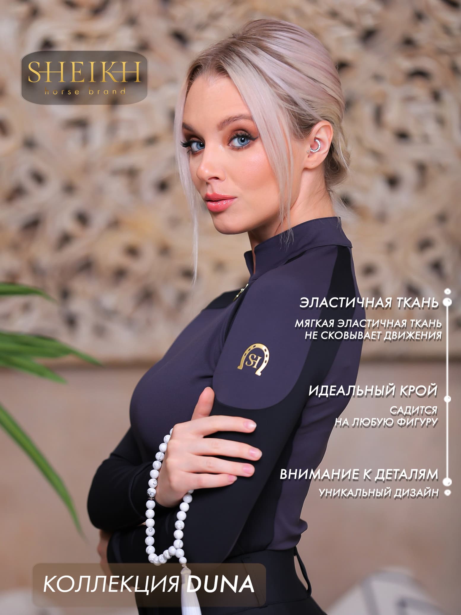 Лонгслив для верховой езды и конного спорта SHEIKH HORSE BRAND Поло с длинным рукавом для верховой езды и конного спорта SHEIKH HORSE BRAND Лонгслив DUNE создан для того, что бы вы получили удовольствие от верховой езды в любую погоду. Мягкая приятная ткань согреет вас и защитит от ветра. Весь дизайн стремиться подчеркнуть ваш силуэт и элегантность линий. Рукав реглан обнимает ваши плечи. Скрытая молния дает свободу действий и выбора. Фирменная фурнитура с логотипом удобно ложился в руку. Каждая деталь подчеркивает вашу индивидуальность, особенность и трепетное отношение к себе. Вам обеспечен великолепный силуэт в седле с лонгсливом от бренда SHEIKH. Детали: Изготовлен из спортивной ткани. Состав: 20% спандекс 80% полиэстер. Потайная молния. Фурнитура: латунь Брендирование на плече и спине. Уход: Машинная стирка на деликатном режиме, при температуре не более 30С Сушка на открытом пространстве