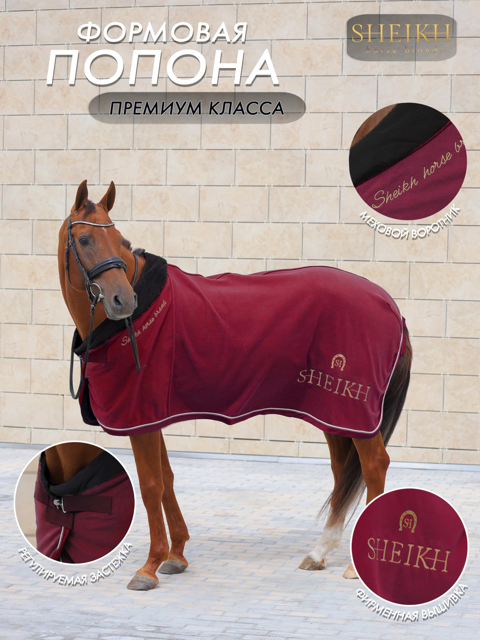 Попона для верховой езды, конного спорта Флисовая попона для лошади от бренда SHEIKH - это не просто попона, это произведение искусства. Мягкая попона окутает Вашу лошадь теплом и заботой. Меховой воротник подчеркнет статность вашего любимца и с невероятной нежностью отнесется к его груди и шее. Попона окантована атласной тканью и украшена витыми шнурами. Детали: Попона изготовлена из плоногофлиса антипилинг. Состав: 100% полиэстер,300 гр м2 Попона украшена фирменными вышивками. Спереди Т-образная пряжка с регулировкой, подхвостник на карбине. Уход: Машинная стирка на деликатном режиме, при температуре не более 30С Сушка на открытом пространстве