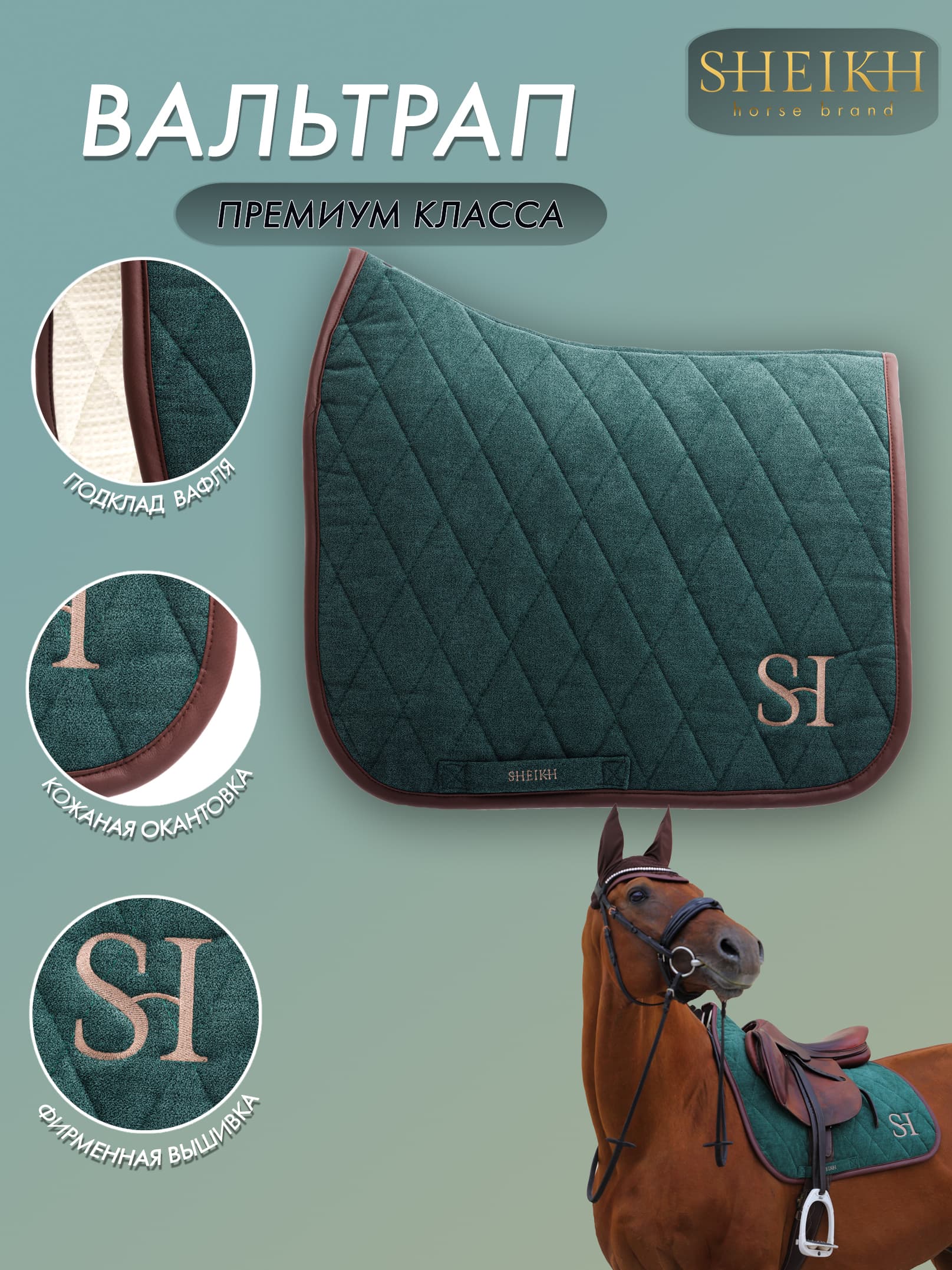Вальтрап для верховой езды, конного спорта Вальтрапы из коллекции FOREST изготовлены в цветах весеннего леса: Белый, подтаевший снег в глубине изумрудной красы хвойных ветвей Струйки синей воды, бегущие по уже теплой земле Первые подснежники и обогретая солнышком кора деревьев. Все это линейка конкурных и выездковых вальтрапов из мягкого велюра с кожаной окантовкой. Коллекция FOREST отражает в себе единение с только что проснувшейся природой. Вдохновленная запахами земли, воды и леса, и свежим теплым ветерком, доносящим ароматы расцветающего, нового мира. Для изготовления этой коллекции мы использовали высококачественный велюр: однотонный, слегка фактурный, с мягкой поверхностью, имитирующей шенилл. Наш вальтрап подчеркнет ваш лаконичный стильный образ и добавит очарование минимализма. Сочные и натуральные природные оттенки коллекции помогут создать ту самую атмосферу, в которой будет приятно и отдыхать, и работать Хлопковый вафельный подклад быстро впитывает пот лошади и бережно относится к ее коже и шерсти. Собственное производство позволяет нам отшивать вальтрапы премиального качества , отслеживая и контролируя все этапы создания нашей продукции на высшем уровне. Стань частью искусства вместе с SHEIKH HORSE BRAND Роскошь, которая вдохновляет. Уважение, которое связывает. Уход: Машинная стирка на деликатном режиме, при температуре не более 30С Сушка на открытом пространстве