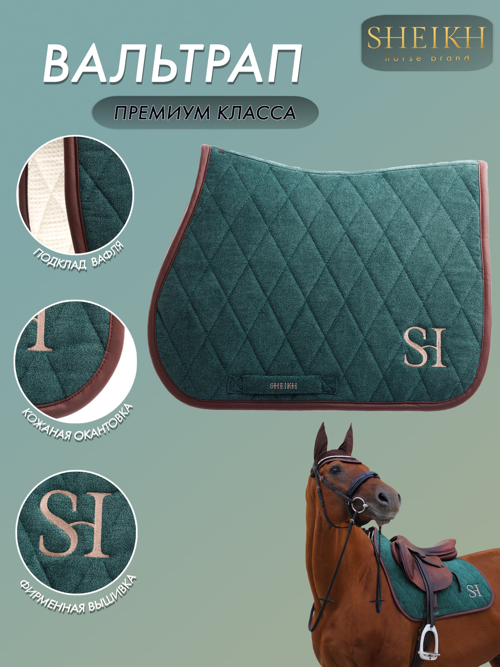 Вальтрап для верховой езды, конного спорта Вальтрапы из коллекции FOREST изготовлены в цветах весеннего леса: Белый, подтаевший снег в глубине изумрудной красы хвойных ветвей Струйки синей воды, бегущие по уже теплой земле Первые подснежники и обогретая солнышком кора деревьев. Все это линейка конкурных и выездковых вальтрапов из мягкого велюра с кожаной окантовкой. Коллекция FOREST отражает в себе единение с только что проснувшейся природой. Вдохновленная запахами земли, воды и леса, и свежим теплым ветерком, доносящим ароматы расцветающего, нового мира. Для изготовления этой коллекции мы использовали высококачественный велюр: однотонный, слегка фактурный, с мягкой поверхностью, имитирующей шенилл. Наш вальтрап подчеркнет ваш лаконичный стильный образ и добавит очарование минимализма. Сочные и натуральные природные оттенки коллекции помогут создать ту самую атмосферу, в которой будет приятно и отдыхать, и работать Хлопковый вафельный подклад быстро впитывает пот лошади и бережно относится к ее коже и шерсти. Собственное производство позволяет нам отшивать вальтрапы премиального качества , отслеживая и контролируя все этапы создания нашей продукции на высшем уровне. Стань частью искусства вместе с SHEIKH HORSE BRAND Роскошь, которая вдохновляет. Уважение, которое связывает. Уход: Машинная стирка на деликатном режиме, при температуре не более 30С Сушка на открытом пространстве